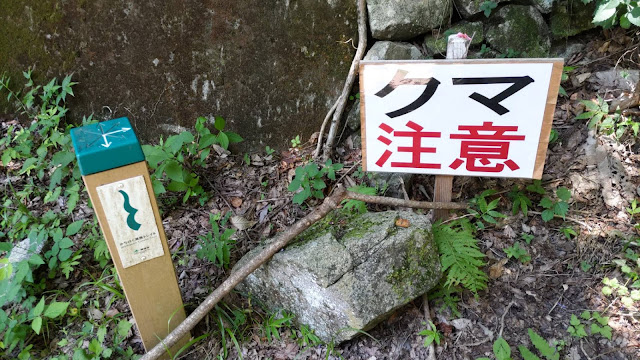 「クマ注意」…踏まれてない山道だ。クマのいそうな雰囲気満載だ…こわい…ふたりでクマよけ笛をピーピー鳴らしながら。おまけになんて登り坂なんだよ。しんどいわ、こわいわ…薄暗い森の中をどんどん進む。