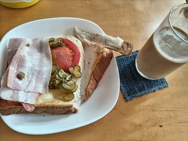 チーズ、トマト、キューちゃん、ベーコン、なんだけど、スモモジャムをぬって食べたい。ちぎったミミにジャムとクリームチーズをのせて食べたいから。